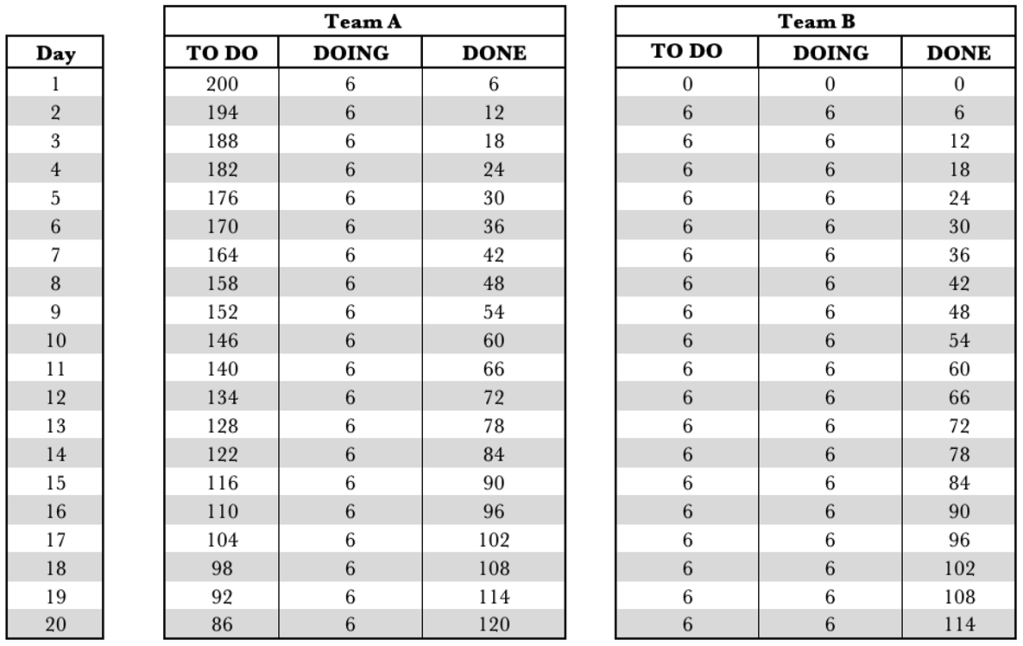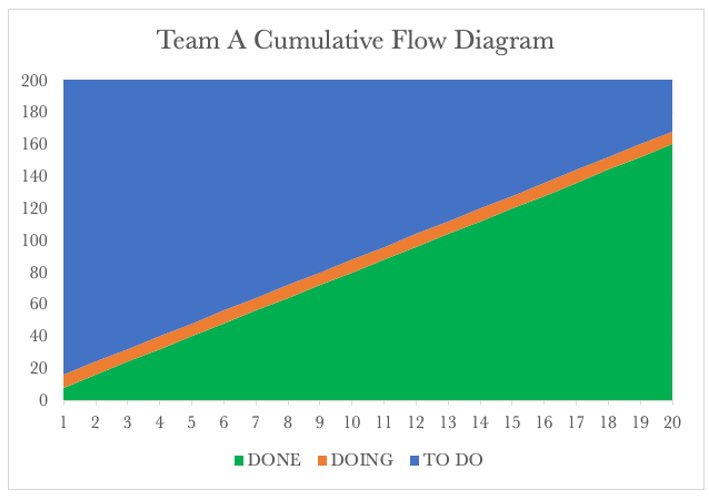 Team A’s CFD shows the burndown of the 200 requests over time. After 20 days, Team A has serviced 120 requests and passed these on to Team B.