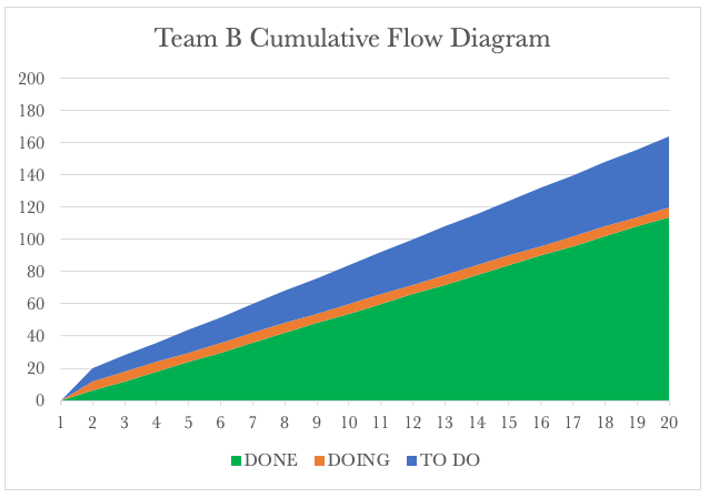 Team A’s CFD shows the burndown of the 200 requests over time. After 20 days, Team A has serviced 160 requests and passed these on to Team B.