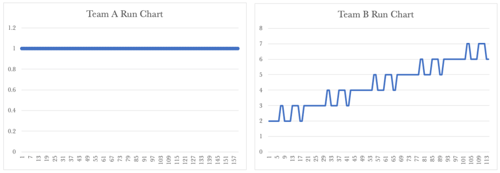 Team A’s Run Chart shows a steady cycle time of 1 day.