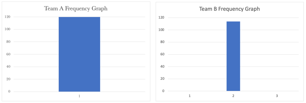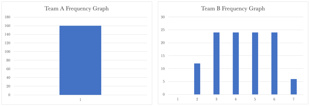 Team A’s Frequency Graph shows a steady cycle time of 1 day for their requests. Team B’s shows a wide distribution of frequency. So whilst we have part of our service stable, the other part of the service is spiralling out of control. Knowing that we need to look at the service as a whole, we have a situation that needs our attention.