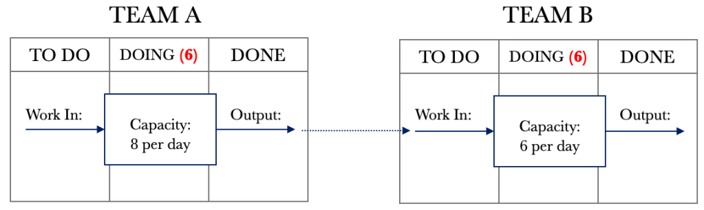 So how could we handle this situation? Mapping out the system shows that we have a constraint; Team B. One way to tackle our problem is to limit the WIP for both boards to 6, our constraint. You may initially get push back that this is unacceptable, as we will have people or resources that aren’t busy all the time. I would respond with, ‘Would you rather have longer cycle times and increased WIP or the ability to have due date predictability and improved performance?’