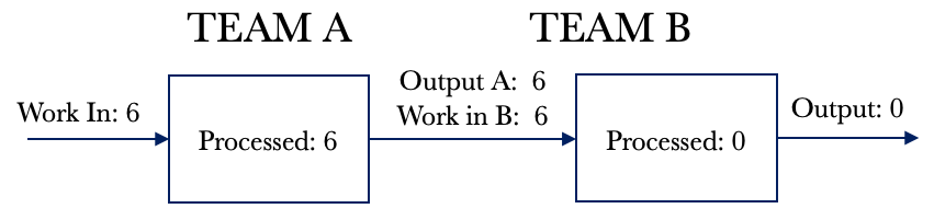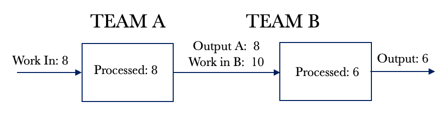 The table above shows Team B’s WIP growing by 2 per day. It also shows that over the 20 days, Team A completed 160 requests, and Team B completed 114 requests. Our overall performance for the end-to-end service was 114 requests fulfilled. With dependent systems, we have to look at the service as a whole. We cannot look at the individual performance of the components.