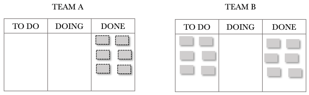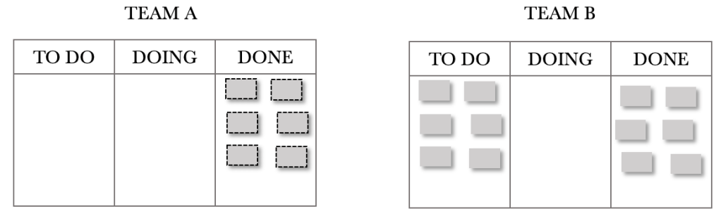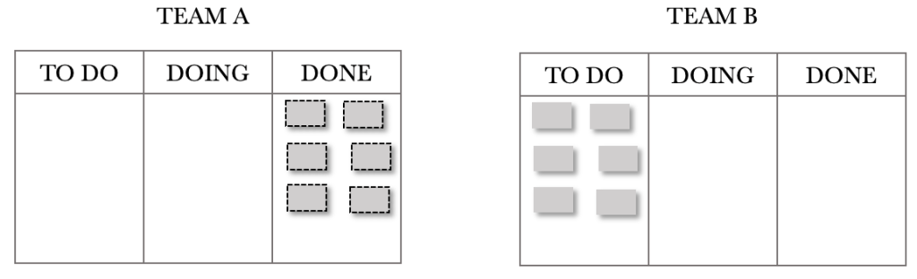 Let’s see how this plays out on the Kanban Boards. The sequence shows the first few days. For the illustration below, I have chosen not to show the 200 backlog items but instead decided to show the requests pulled through on the day. There are no requests shown in Team A’s TO DO because of this. Note that the board position shows the end of the day, so the tickets will appear in the DONE column. I want to convey the build-up of WIP we see in Team B’s TO DO. The end of Day 1 is shown below.
