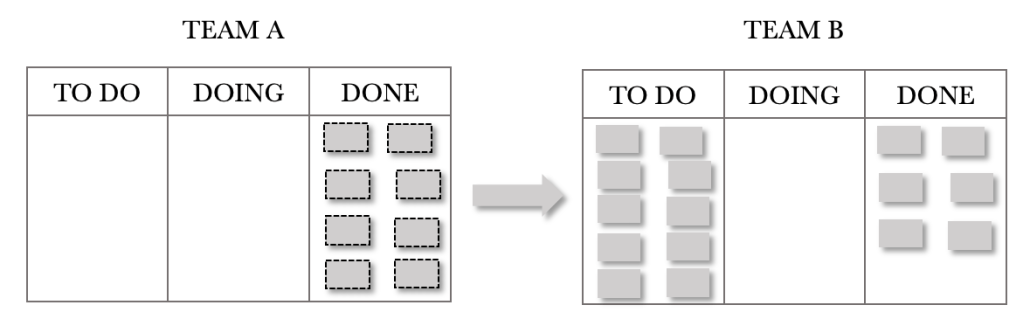 The diagram above shows that Team A can service eight requests per day and that Team B can service six requests per day. For our example, we will assume that demand exceeds capacity and that Team A will always be in a position to pull eight requests per day. With dependent Kanban boards, it is important to note that the DONE column feeds the TO DO column of the other. We could also represent the above situation on a single board, but for now, let’s consider them separate as this is a good way for us to visualise the effects of dependency.