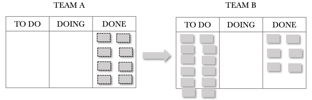 The constraint, Team B in our case, should be considered the ‘Drum’ for the system. The Drum sets the pace at which we can service requests.